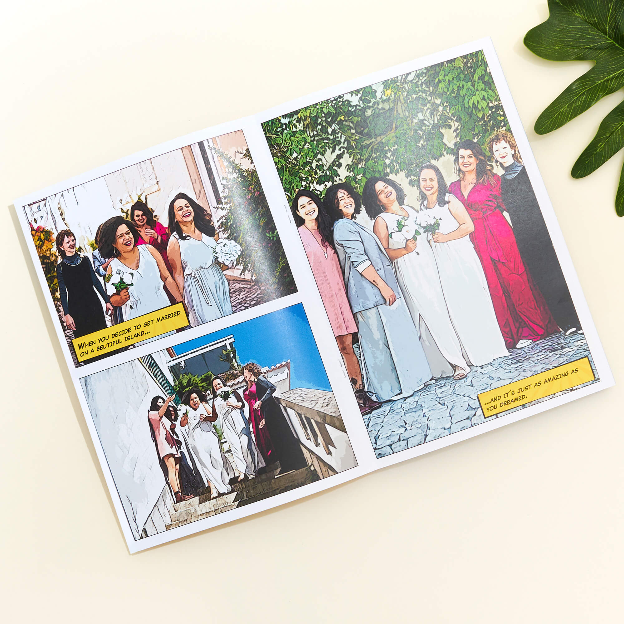 1) You order your own personalized comic book and we send you an easy-to-use template where you can upload your photos and write the story (that part is optional)
